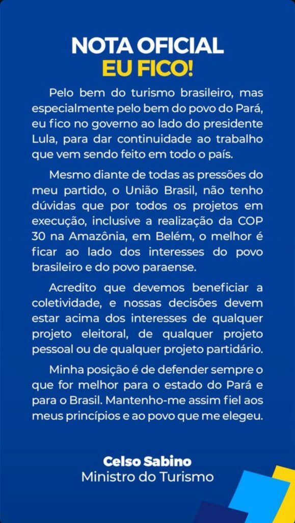 Em uma coletiva de imprensa, realizada à tarde, Sabino afirmou que vai permanecer no governo Lula. “Pelo bem do turismo e dos serviços que vemos fazendo em todo o país, principalmente do Pará, pela realização da COP 30, eu vou permanecer no governo”, adiantou.Atualmente, Celso Sabino participa das decisões partidárias a nível nacional e ocupa uma vaga na executiva nacional e outra no diretório nacional do partido. Com a decisão desta quarta, ele não poderá mais exercer as funções. Apenas ele votou contra o próprio afastamento.